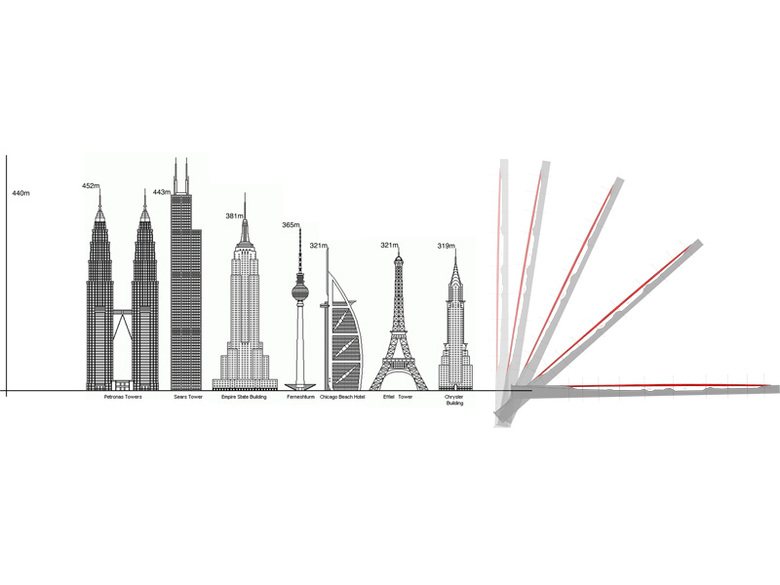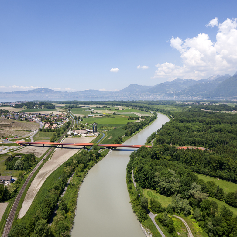 Un pont de quatre-cent-cinquante mètres ne représente pas une intervention anodine dans le paysage. Bien que posé à quelques mètres du sol, l’impact de ce grand objet demeure important. Si les gratte-ciel, ces «architectures verticales», composent avec le sky line de la ville, le pont, considéré ici comme une grande «architecture horizontale», interagit avec un sol. Dans le cas présent, le territoire génère une surface hétérogène composée de champs, d’une route, d’une voie de chemin de fer, de talus, d’un canal, et du fleuve.