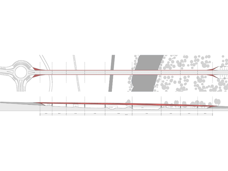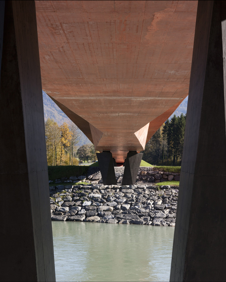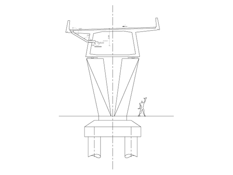 La plasticité du tablier se base sur une réflexion alliant la courbe des moments à la forme: des facettes à chanfrein s’adaptent aux portées changeantes. L’ouvrage est conçu comme une coque qui exprime les efforts en accrochant la lumière de manière particulière. Les piles porteuses adoptent un principe similaire avec un dessin en «V» dont la forme à «bouchain» est répétitive et progressive. Enfin, les deux culées, qui marquent la fin, l’ancrage et le retournement du pont sont une sorte de «main ouverte» sur laquelle le tablier vient s’appuyer.