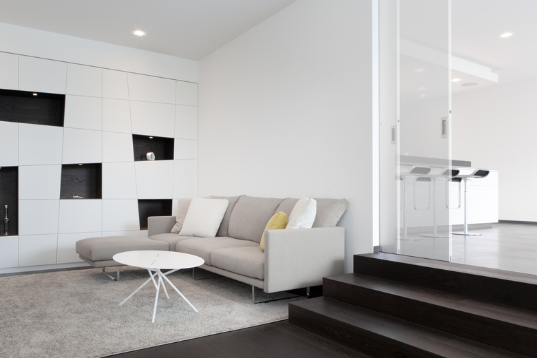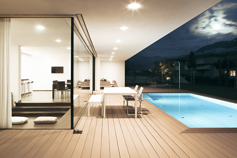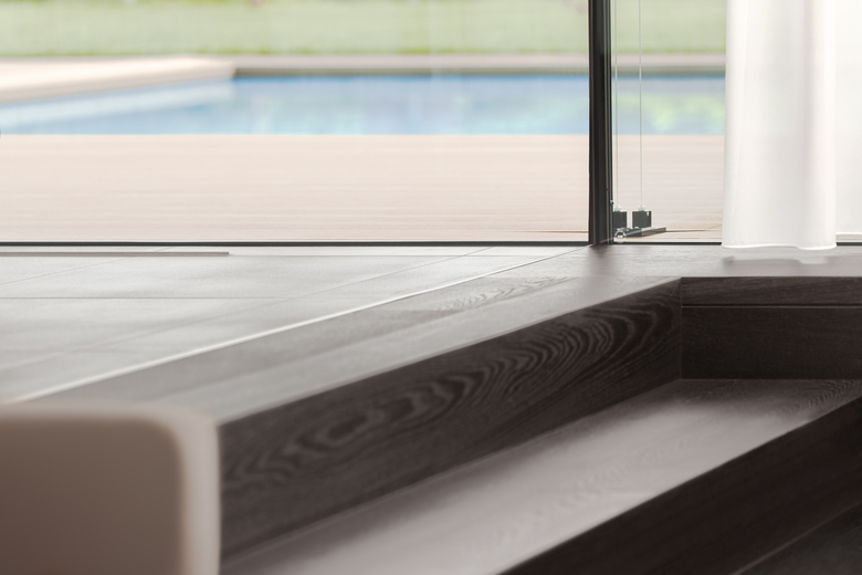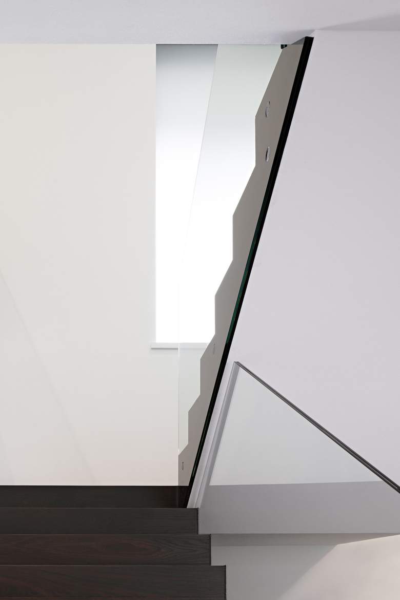 Una parete continua parallela alle vetrate divide la zona notte dalla zona giorno, per questo emerge una chiara e funzionale divisione degli spazi interni a favore di una illuminazione differenziata.