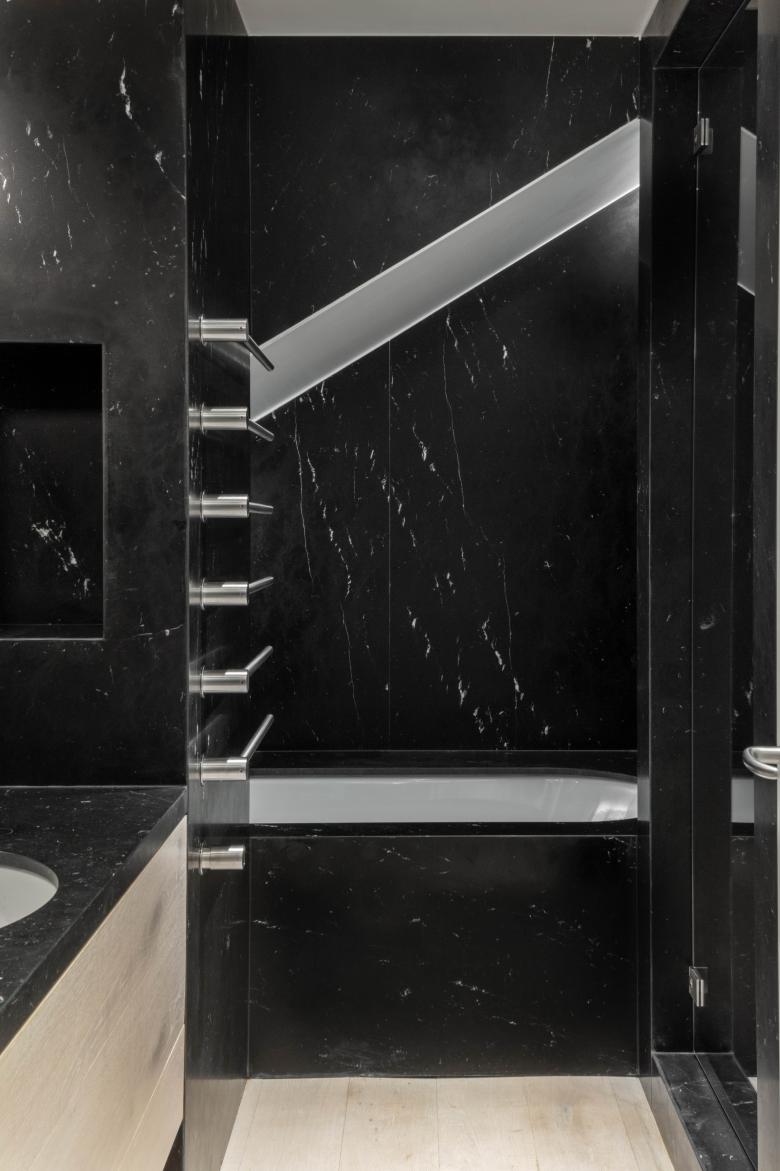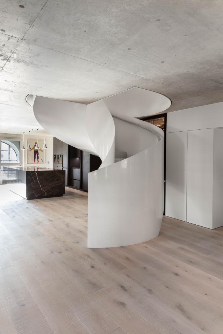 Located in the center of historical Vevey, Switzerland, Riviera Loft is a three-story residence set within an industrial building from the 1900s. Rich with texture and history, Riviera Loft was approached with the ambition to preserve the character of the industrial space while still allowing for updates and modern conveniences to accommodate a growing family. To achieve this duality, exterior walls were retained, and focus was placed on fostering a lightness within the interior. Solid walls were softened with rounded corners, and wherever possible, transparent glass was used to embrace natural light and open the space. Each level was designed to serve a specific purpose, with the first level dedicated to the living spaces, the second floor designed for the children's rooms and common space, and the third floor featuring the primary bedroom and bathrooms. A dramatic circular staircase connects all three levels together, reflecting, in form, the original circular window that lines the southern facade. A tonal palette of light oak wood, smoked glass, and black marble is used throughout to create a minimal backdrop for a curated furniture and art collection.