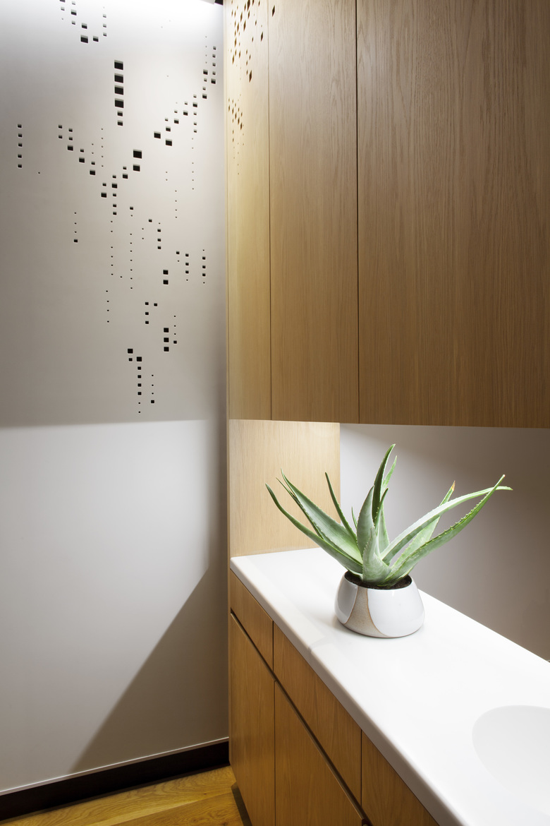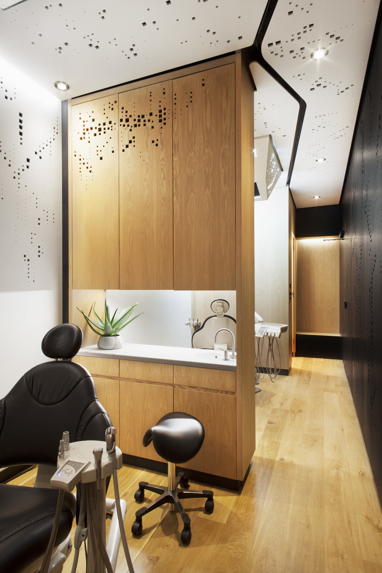 With only 230 interior square feet, the primary challenge was to create the illusion of a more spacious interior, while also packing required program into the tiny footprint, including sterilization room, waiting area, and two operatories. The sterilization room is hidden behind millwork panels that wrap around to form the waiting bench with integrated tablet for patient forms. A centralized, double-sided millwork panel houses equipment for both operatories, while also concealing the sound and HVAC systems. Rather than opening the side panels to potentially unattractive exterior environments (like parking lots), each operatory gestures to the sky, with 11-foot ceilings and translucent sculpted skylights above each chairs, which deliver abundant diffused natural light, and also house TV monitors. Strategic mirrored strips in the corner reveals visually expand the space and reflect natural light. Acoustical dampening material layered in the interior helps to maintain patient privacy. The material palette reinforces the office’s identity, with natural wood millwork, bright white surfaces throughout, and a custom perforation pattern that suggests a dense tree canopy. The 26-foot-long trailer’s exterior features reflective detailing that brings the same custom perforation pattern to the exterior panels, at once a memory of the original utilitarian trailer function, layered with the new use through the client’s branding and imagery.