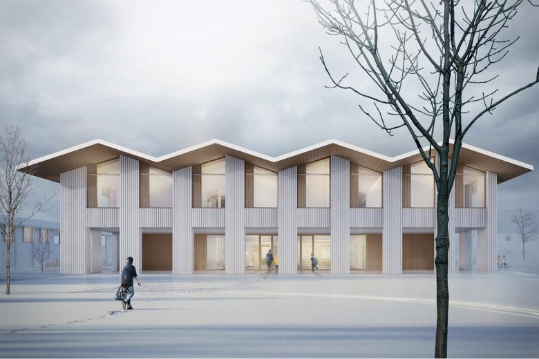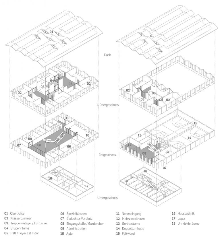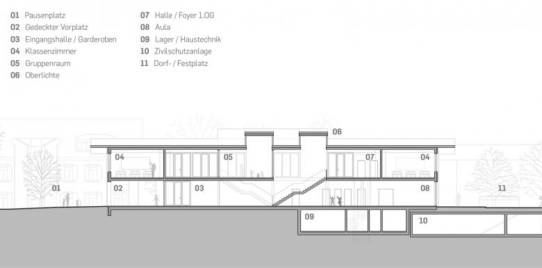Das Programm ist analog zur Umgebung auf hauptsächlich zwei Etagen angelegt, was dem Komplex eine menschliche Dimension verleiht. Das äussere Erscheinungsbild sowie die Öffnungen stehen im Dialog zu den historischen Gebäuden, die zusammen das Dorfzentrum bilden. Durch die freie Interpretation des ortstypische Satteldachs gewinnt der öffentliche Holzbau an Modernität. Oblichter führen Licht in die Tiefe des Grundrisses und aktivieren die Begegnungs- und Arbeitszonen in der Mitte der beiden Schulgebäude. Das Projekt präsentiert sich als sichtbare Holzkonstruktion mit quadratischem Raster aus vorgefertigten Hybriddecken, durch Stahlbetonkerne ausgesteift und verstrebt. Offen und einladend nach aussen, überzeugt die neue Schule in erster Linie durch ihre Nachhaltigkeit und Ökologie, die innovative Holzkonstruktion, ihre hohe Nutzerflexibilität sowie dem Anspruch, eine Schule als Begegnungsort zu kreieren.