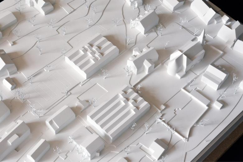 Das Dorf Courtételle hat sich um eine zentrale Grünfläche entwickelt, auf der heute die öffentlichen Gebäude der Gemeinde angebracht sind. Mit der Positionierung der beiden neuen Volumen wird diese Idee noch verstärkt. Freie und bebaute Räume ergänzen sich und schaffen zwischen den verschiedenen Gebäuden (Kirche, Kinderkrippe, Schule etc.) weite Ausblicke zum Juragebirge am Horizont. Das Hauptgebäude der Schule (Gebäude B) wird weiter östlich positioniert, um einen grosszügigen Freiraum zwischen dem bestehenden Gemeinschaftsgebäude, dem Kindergarten im Norden, dem neuen Volumen und der Wiese im Süden, zu schaffen. So werden das Foyer Notre-Dame und die Maison de l'Enfance in die Komposition integriert. Dem Volumen des Hauptgebäudes entsprechend, ersetzt die neue Turnhalle (Gebäude A) die alte Fabrik und rückt leicht nach Nordosten. Abschliessend vereint der Pausenplatz als zusammenhängende Fläche die drei Schulgebäude, lässt ihnen aber ihren individuell auf die Bedürfnisse abgestimmten, spezifischen Aussenbereich.