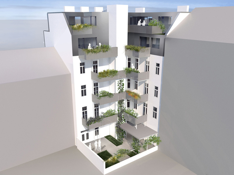 Verbesserung des Wohnkomforts – Im Innenhof wurden acht Balkone angeordnet, um möglichst viele der Bestandswohnungen mit privaten Freiflächen aufzuwerten. Ein Großteil der Wohnungen konnte generalsaniertwerden. Dabei wurde neben dem Einbau von Bädern und WCs auch auf zeitgemäße Neugestaltung der Grundrisse geachtet. 100 % der Putzoberflächen wurden in den Wohnungen erneuert, sowie 100 % der Fußbodenaufbauten, die nun den derzeitigen technischen Anforderungen hinsichtlich Schall- und Wärmeschutz entsprechen.