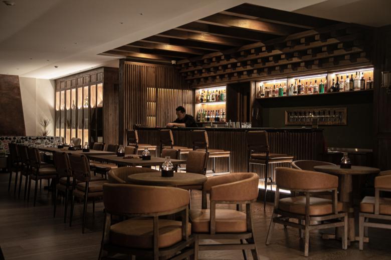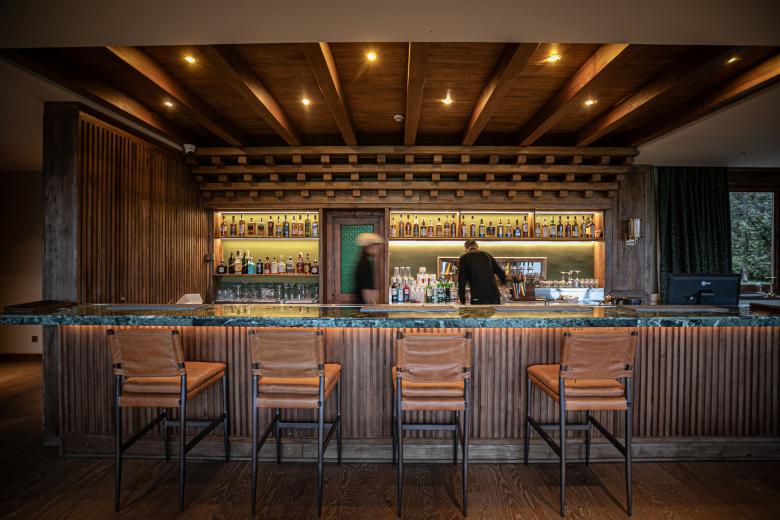 As the most important functional area within the bar, the bar counter naturally becomes the visual focal point of the entire space and therefore requires special attention. In this project, the bar counter serves as the core element reflecting the local character of the space. By incorporating structural features of traditional Tibetan architecture, the bar area offers a heightened sense of spatial dimensionality. The bar's main structure adopts traditional Tibetan mortise-and-tenon craftsmanship, meticulously assembled by local Shangri-La artisans using native walnut wood, achieving a seamless fusion of structure and ornamentation. The natural stone countertop and solid wood cabinetry panels further demonstrate a deep respect for traditional local materials and artisanal excellence.