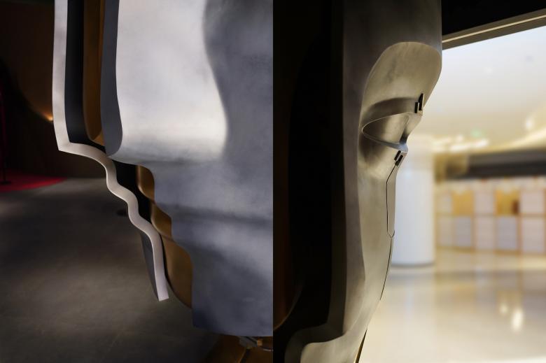 装置由不同形态的多张面具构成:正面横向展开的面具背后是另一张充满雕塑感的面庞,象征未知与无限;侧面造型则遵循简明的几何推演规律,使其更具希腊古典韵味。