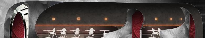 开幕前,入口幕布打开,观众可进入酒吧享受闲暇时光的一杯小酌,演员则在剧社进行创作、排练,剧场内则进行着设备调试与场地布置。随着暗示“即将开演”的幕布落下,以装置艺术为引导,观众开始通过拱形隧道进入主空间,穿行在细长的前场通道内,昏暗的灯光,朦胧的幕布与肌理,都在一步步过渡、削减观众对外部商场的空间感知,使其从现实世界逐步剥离,沉浸于曲线与光影交织的“洞穴”中。