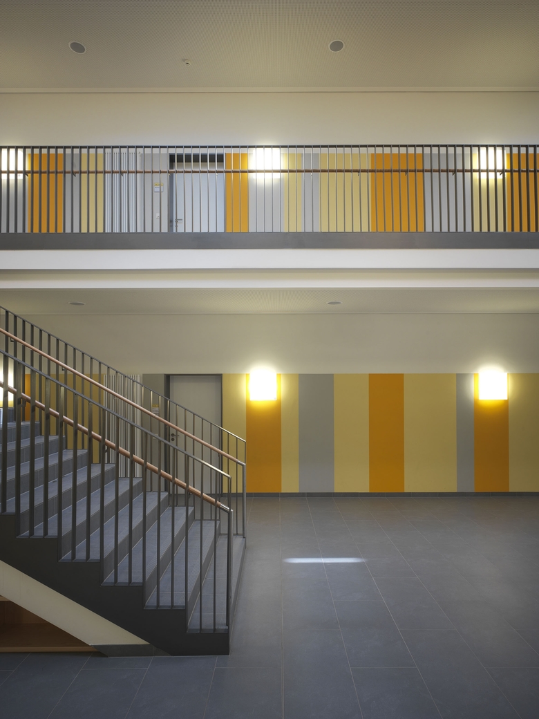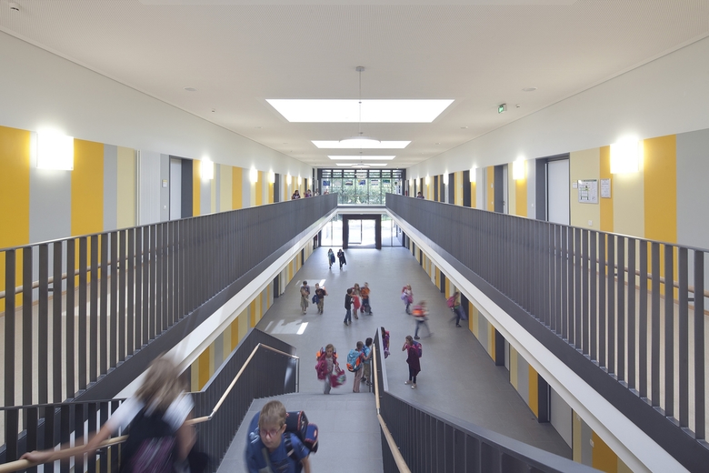 Der Neubau ist als Solitärbau Teil des bestehenden Schulzentrums, Grundschule und Mehrzweckhalle sind direkt ablesbar. Alt- und Neubau bilden ein Ensemble ohne dass die eigenständigen Charakteristika der einzelnen Gebäude verloren gehen. Die Grundschule ist als kompakter kubischer zweigeschossiger Baukörper konzipiert. Prägende Gestaltungselemente sind die zentrale Erschließungshalle, die gleichzeitig das Forum beinhaltet und der Innenhof. Eine Galerie-aufweitung bietet Platz für einen offenen Sitzbereich mit Blick auf das schulische Leben. Rund um den Luftraum des Forums ermöglichen Verglasungen in der Fassade Blickbezüge.