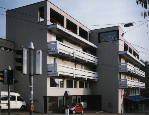 Im Erdgeschoss liegen Läden, mit grossen Schaufenstern. Im ersten Obergeschoss wurden die Büros mit internen Treppen neu dem Erdgeschoss zugeordnet.Im ersten Wohngeschoss wurden die bestehenden 1-Zimmer-Wohnungen so belassen wie sie sind, weil die Trennwände tragende Scheiben sind, die den darunterliegenden stützenfreien Büroraum überspannen.