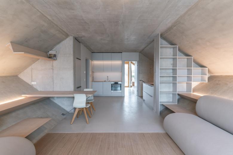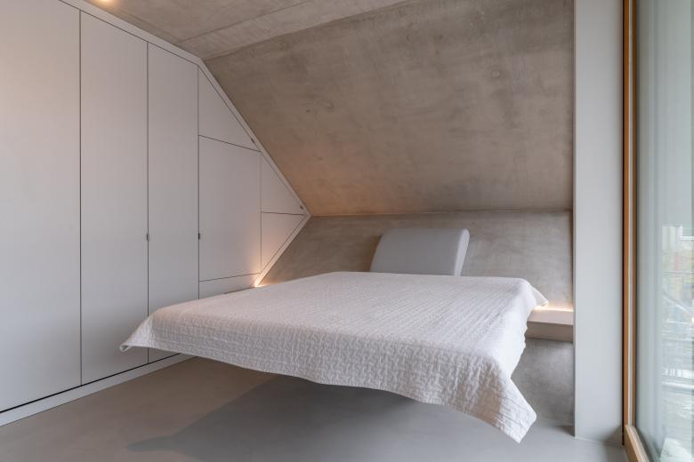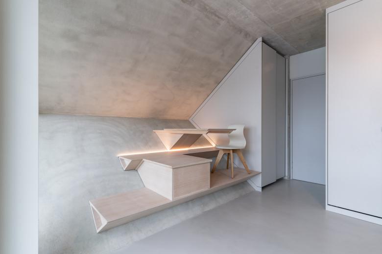 Jede Wabe ist im Querschnitt gleich dimensioniert: Die Wabenform mit einer Raumhöhe von 2,65 Metern und spitzen Winkeln von 36,2 Grad vergrößert aufgrund spezieller Möbeleinbauten, mit denen auch die Schrägen bewohnt werden können, Nutzfläche wie Wohnraum. Schräge Decken erweitern so die nutzbare Bodenfläche, bieten maximalen Stauraum entlang der Innenwände und integrieren platzsparende Einrichtungsgegenstände. Für die Wabe wurde ein Möbelsystem entwickelt, das es den Bewohner*innen ermöglicht, die Nischen effektiv zu nutzen. Teil der Grundausstattung jeder Wohnung ist eine keilförmige Sitzbank mit integriertem Stauraum. Sie ist so positioniert, dass auch andere vom Büro Haimerl entworfene Möbel wie schwebende Betten, Sitzkissen oder ausziehbare Tische dort Platz finden können. Auf diese Weise werden die beiden Wabennischen zu individuell möblierten Rückzugsorten, während der Bereich dazwischen frei bespielbar bleibt. Zusätzlich bieten die Nischen Platz für verschiedene Einbauschränke und Küchen, die teilweise in die Schrägen integriert sind. Die flexibel platzierbaren Sitzkissen ermöglichen eine spielerische Aneignung der Wohnung.