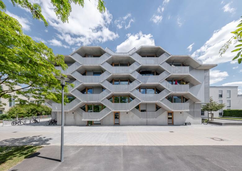 Die Hexagonalstruktur erlaubt intelligente, räumliche Verschachtelungen und ermöglicht unzählige Kombinationsmöglichkeiten von Raumeinheiten: Es gibt 22 Einheiten zwischen 22 und 106 Quadratmetern, darunter Maisonetten mit 1 bis 4 Zimmern, aber auch einzelne Wabenzimmer mit eigenem Bad, die über das gesamte Haus verteilt sind. Beim WG-Modell steht den Bewohner*innen ein Gemeinschaftsraum mit Küche zur Verfügung, der zugleich als Ess- und Wohnzimmer dient. Hinzu kommen weitere Gemeinschaftsräume, eine Fahrradwerkstatt, ein Quartiersladen, ein Gästeappartement und eine gemeinschaftlich nutzbare Dachterrasse. Das Konzept gemeinsamer Wohnräume fungiert als zentraler Knotenpunkt und fördert Gemeinschaftskultur und gemeinsame Wohnerlebnisse.