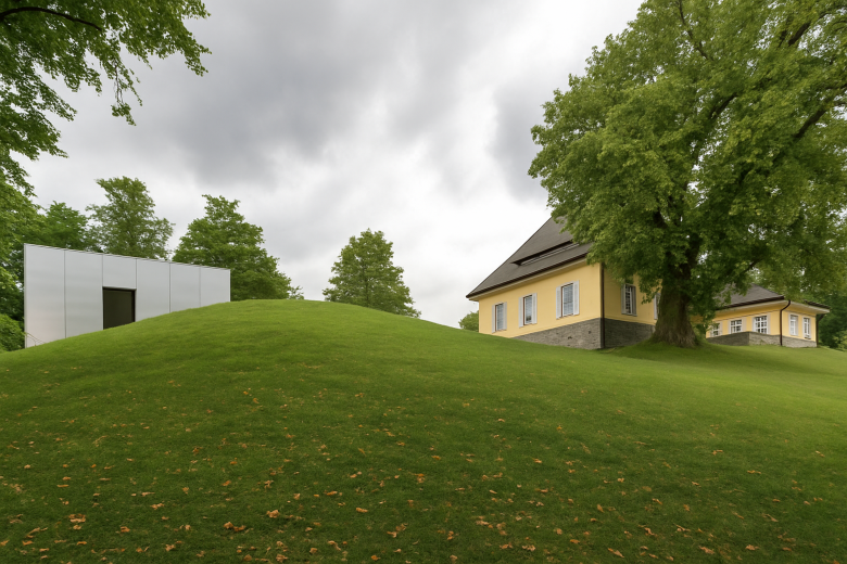 Die Anmutung des denkmalgeschützten Hauses und des Parks bleibt von allen Ansichten bestehen. Der Hügel des Parks gibt das Geheimnis in seinem monumentalen Inneren nicht Preis.