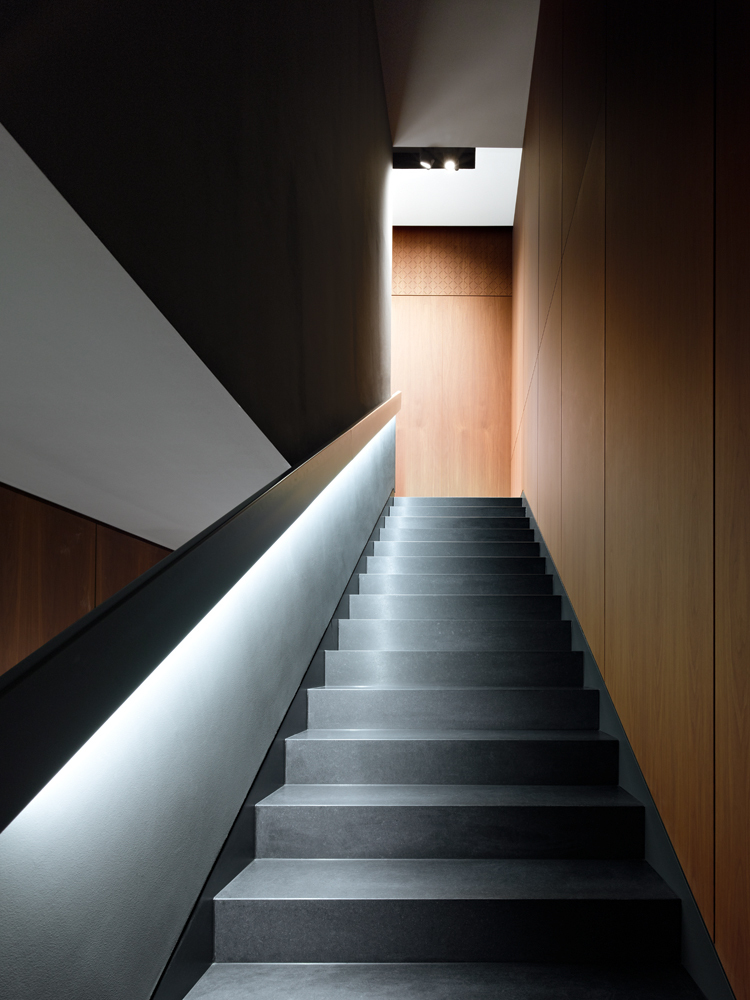Der warm-orange „glow“ innerhalb des abgehängten Deckenelementes entsteht durch farbig bedruckte Glasflächen, die von oben durch eine homogen leuchtende Foliendecke illuminiert werden. Parallel zur Foliendecke nehmen mattschwarze Deckenkanäle die Strahler zur punktuellen Produktinszenierung auf. Die schwebende Leichtigkeit der Displays erzeugen LED-Strips im Sockelbereich, deren Licht durch einen weichen Diffusor mild vom polierten Granitboden reflektiert wird.