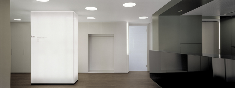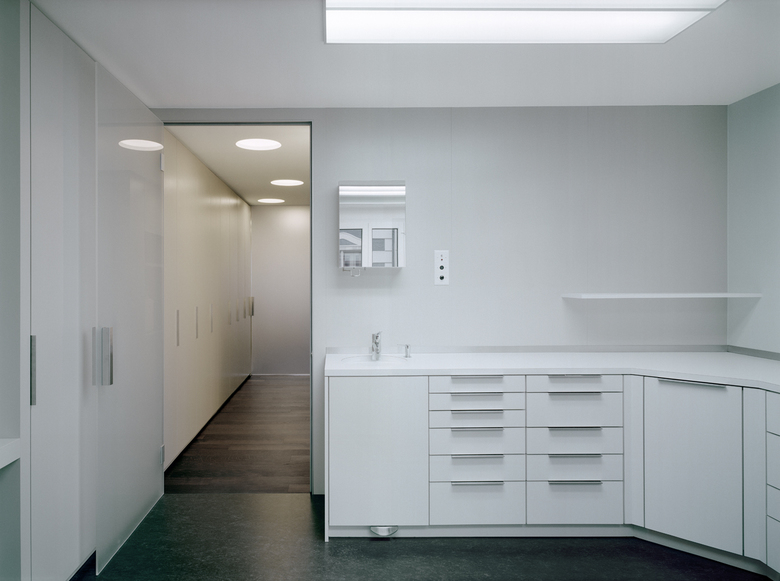 Eine angenehme, wohnliche Atmosphäre und warme Farbtöne für den Empfangs- und Korridorbereich sind für den Einbau der Zahnarztpraxis mit 6 Behandlungsräumen die Vorgaben gewesen für den Entwurf. In Zusammenarbeit mit Farbgestaltern und Graphikern ist eine Praxis entstanden die eine klare Trennung zwischen den allgemeinen- und den klinischen Räumen schafft. Dunkler Parkettboden, erdfarbig gespritzte Einbauten und warmes Licht im Empfangsbereich stehen im Kontrast zu den klinischen Räumen in Weiss und Hellblau mit kaltem Licht, die eine Atmosphäre von Hygiene und Reinheit vermitteln.