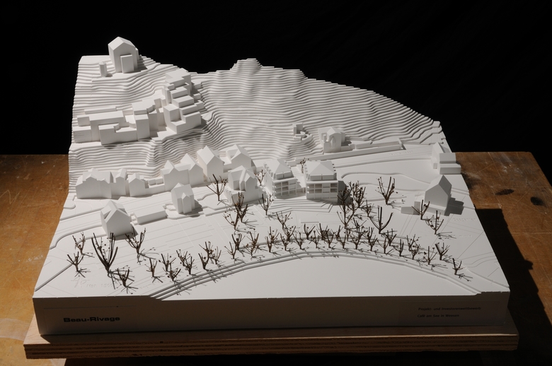 Das zu bebauende Grundstück liegt im östlichen Ausläufer der Kernzone von Weesen. Um die Körnung der bestehenden, dem historischen Ortskern vorgelagerten Häuserzeile zu respektieren werden zwei Gebäudevolumen vorgeschlagen. Dieses Ensemble markiert neu die östliche Zugangsituation zum historischen Städtli. Durch die Gebäudestellung entsteht strassenseitig ein kleiner Platz, welcher den öffentlichen Charakter der Erdgeschossnutzung akzentuiert und Distanz zum steinernen „Schlössli“ auf der anderen Strassenseite schafft. Zudem orientieren sich die Bauten auf der leicht erhöhten Parzellenlage klar zum See und zum grandiosen Alpenpanorama.