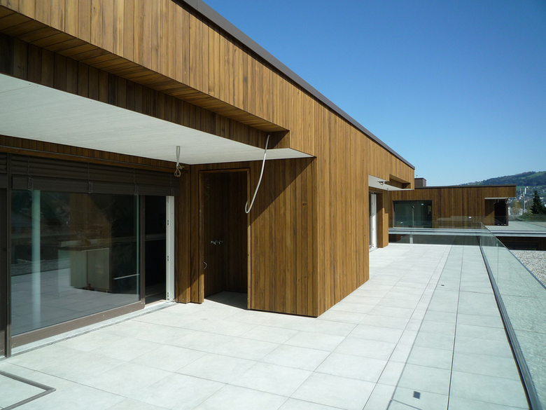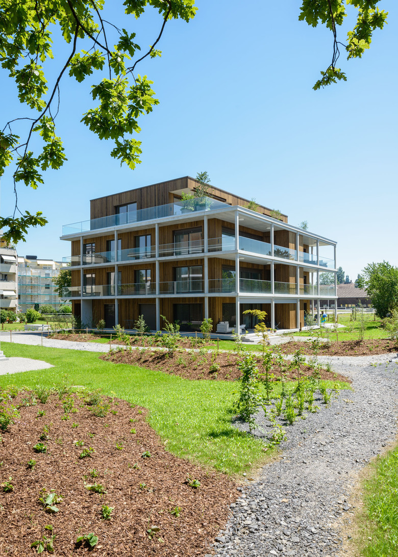 Die beiden Wohnhäuser sind beide in Holzbauweise erstellt mit einem massiven Erschliessungskern aus Sichtbeton. Die hinterlüfteten Holzfassaden aus druckimprägnierter Fichte widerspiegeln die Holzkonstruktionen der Häuser und wecken Erinnerungen an den einstigen wildhaft überwachsenen Garten. Mit dem nussbaumbraunen Farbton erscheinen die frugalen Fichtenbretter nun als nobles Fassadenkleid undund unterstützen das elegante Erscheinungsbild der Gebäude.
