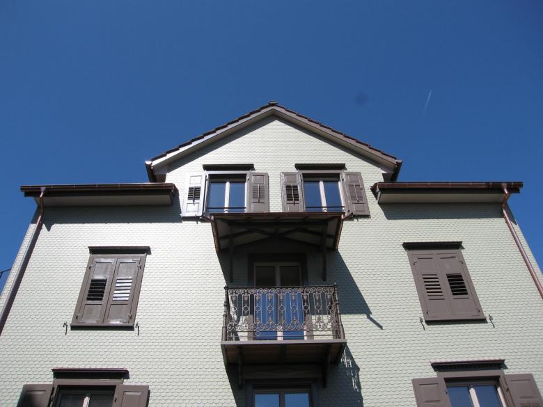 Das in die Jahre gekommene Wohnhaus bildet den Auftakt zur einer kleinen, charmanten Häuserzeile an steil abfallender Strasse. Der tiefgreifende Umbau umfasst neben der energetischen Sanierung der Gebäudehülle auch eine komplette Innensanierung der 3 Geschosswohnungen. Der einseitige Giebel auf der Ostseite wurde in gleicher Art auch westseitig erstellt und so entstand nun ein klassisches Kreuzgiebeldach. Auf der bestehenden Garage steht neu ein Balkonvorbau mit trapezförmigem Grundriss. Die sorgfältige Wiederherstellung der feingliedrigen Fassade war oberstes Gebot: Die originalen Fensterläden, der Hauseingang sowie der kleine Ostbalkon wurden restauriert, die Fenster und Fenstereinfassungen dagegen sind allesamt neu, aber originalgetreu nachkonstruiert. Der hübsche Vorgarten, eingefasst von einer Sandsteinmauer mit aufliegendem geschmiedetem Geländer, wurde nicht wie üblich zu einem öden Verbundstein-Parkplatz degradiert, sondern konnte wiederhergestellt werden als grüne Zierde dieses ehrwürdigen Wohnhauses in klassischem Landhausstil.