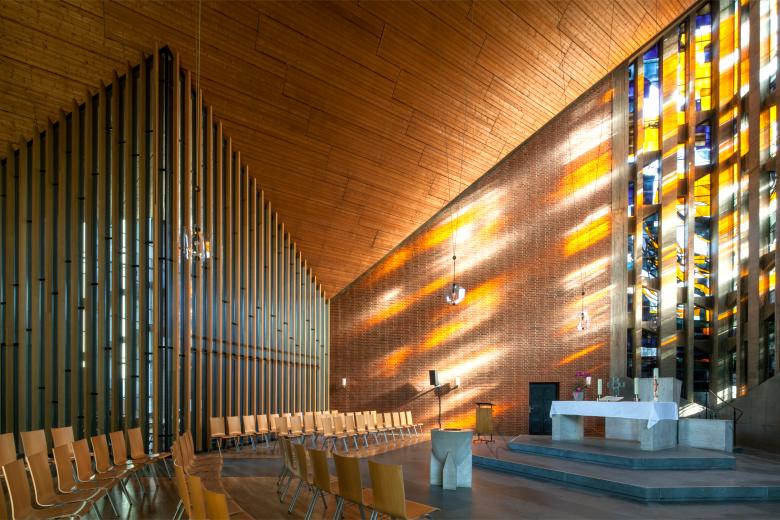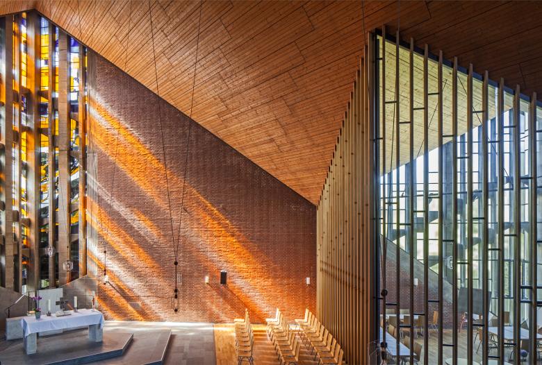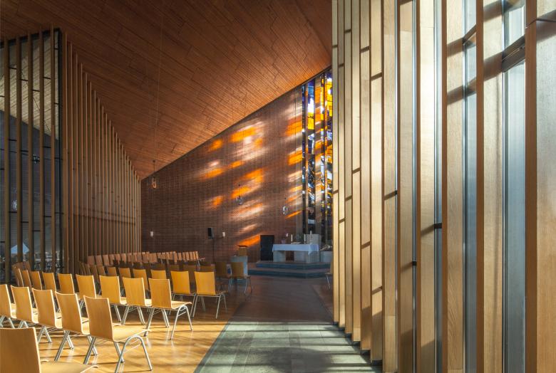 Ein auffälliges Architekturmerkmal innerhalb der Kirche bildet die raumprägende, in mehreren Ebenen gefaltete, Dachlandschaft aus Holz.