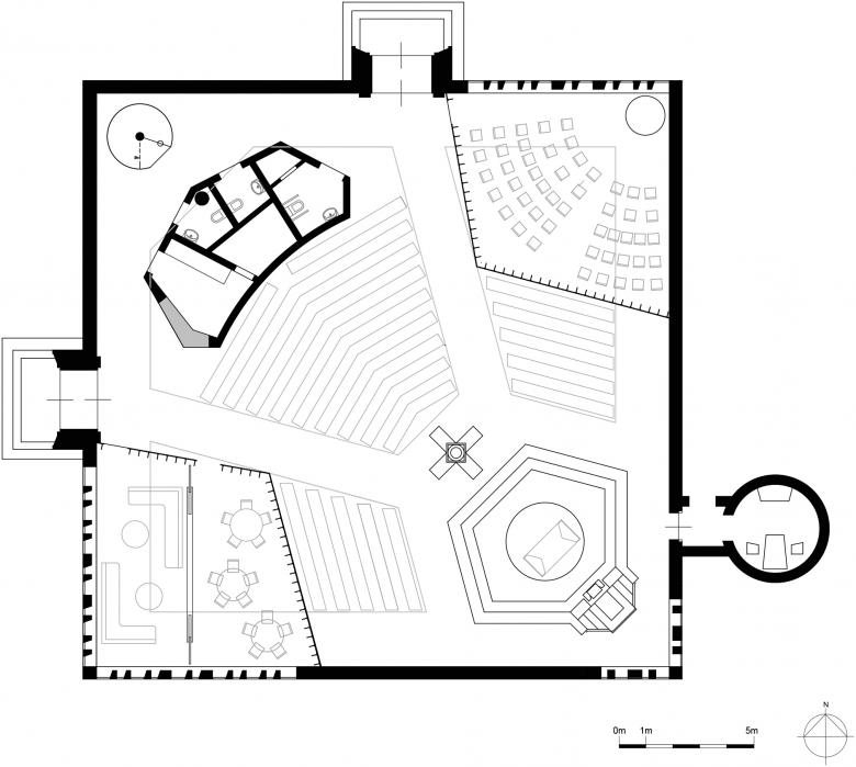 Die Filigranität der Körper ist dabei durch einen Rhythmus von vertikal angeordneter Eichenlamellen geprägt, dessen Zwischenraum verglast ist. Bei Bedarf lassen sich Teilbereiche der Lamellen, durch speziell für das Projekt konstruierte Dreh- und Schiebeelemente, verschieben, so dass sich beide Kabinette bei entsprechenden Veranstaltungen großzügig zum Altar öffnen lassen. Je nach Sonnenstand und Standpunkt des Betrachters ergeben sich innerhalb des Raumes interessante Szenarien der Wahrnehmung, welche zwischen Licht und Transparenz changieren. Diese Idee für das Konzept der transparenten Kabinette mit ihren vertikalen Eichenholzstrukturen beinhaltete in dem Zusammenhang zudem, dass zwischen bestehendem Raumgefüge und Neubauten ein kompositorischer Dialog entsteht, in welchem eine feinsinnige Rücksichtnahme des Bestandes maßgeblich ist.