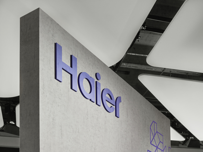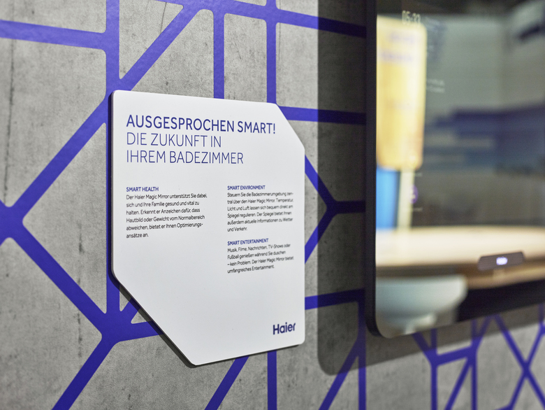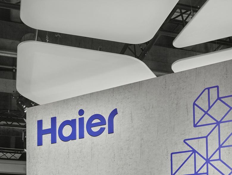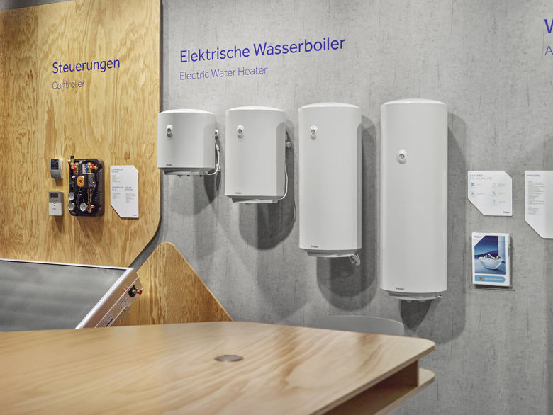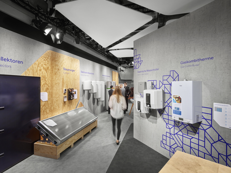 Verbindendes formales Element ist dabei das Haier Network Pattern – als Wand-, Boden- und Deckenelement bis zum Produktschild und Netzgrafik. Die Produktvielfalt an Kollektoren, Wärmepumpen, Speicher und Boilern werden in einer Line-Up systematisch gezeigt. Neuheiten, Kombisysteme und ein attraktives Messeangebot sind an freistehenden Wänden in den Vordergrund gerückt.
