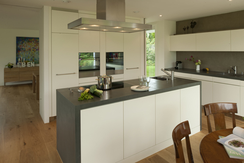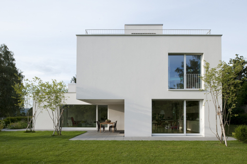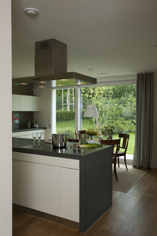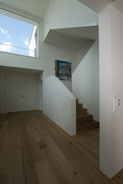 Das Haus steht längs zum Hang und zur Aussicht, was eine Differenzierung von hinten (geschlossene Fassade, hoher Baukörper) und vorne (grosse Öffnungen, abge-stuftes Volumen) zur Folge hat. Im Schnitt wie im Grundriss wird mit einer Vergösserung der Abwicklung gegenüber der Sonne und der Aussicht gearbeitet. Im Schnitt entstehen dadurch Terrassen und Aussenbereiche in jedem Geschoss. Im Grundriss ist der zusammen-hängende Bereich „Küche-Essen-Wohnen-Studio“ eine Z-förmige Abwicklung der Haupträume, alle mit Bezug zum Garten.