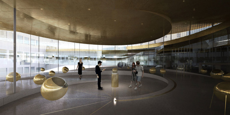 Der Gebäudeentwurf sieht als Grundstruktur eine Doppelspirale vor. Das Untergeschoss wird in Massivbau aus Stahlbeton realisiert, die oberirdischen Gebäudeteile werden als leichte Stahl-Glas-Konstruktion ausgeführt. Die Besonderheit des Tragwerks besteht darin, den gesamten horizontalen und vertikalen Lastabtrag im Erdgeschoss über innere und äussere Glasfassadenelemente zu gewährleisten. Die als Stahlträgerrost mit Profildecke konzipierte Dachkonstruktion mit Spannweiten bis 12m ist unmittelbar auf den tragenden Glaselementen aufgelagert. Da weltweit kaum vergleichbare Projekte als Planungsreferenz zur Verfügung standen, gingen der Projektierung der Glaskonstruktionen umfangreiche Machbarkeitsstudien in Zusammenarbeit mit Glasherstellern und -verarbeitern voraus, planungsbegleitend durchgeführte Bauteilversuche an der Hochschule Luzern dienten der Plausibilisierung der gewählten Berechnungsmodelle. Aufgrund der komplexen Geometrie, die den Einsatz gebogener Gläser mit oben und unten abgeschrägten Bauteilkanten erforderlich machte, erfolgte die Modellierung in einem FE-Programm mit Schalen- und Volumenelementen. Die einzelnen Glaselemente aus 3fach VSG mit einer Breite von 2.44m und Höhen bis zu 6m sind an Kopf und Fuss zweifach punktförmig gelenkig gelagert, womit Zwängungen aus unkontrollierbaren Einspannungseffekten ausgeschlossen wurden.