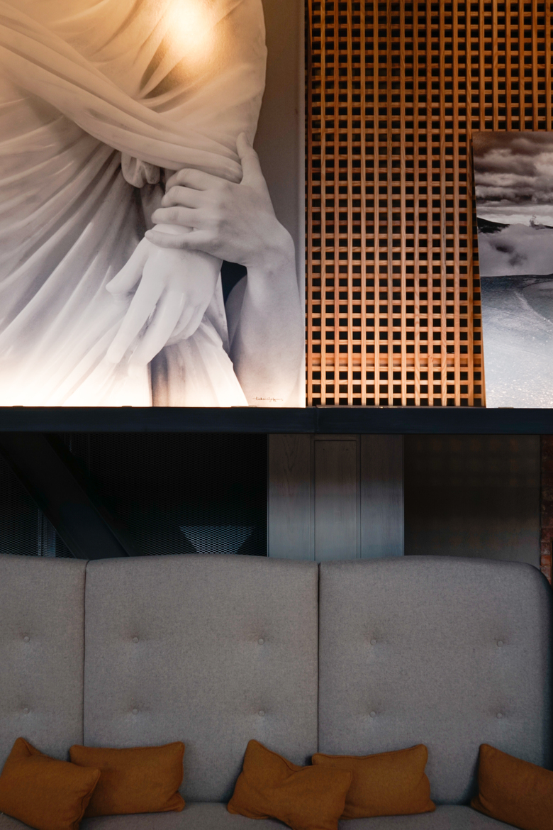 The concept playfully juxtaposes different materials and surfaces over some features of the pre-existing structure, while images by Turkish Photographer Mr. Tahsin Aydogmus are spread out over an oak louver, and below it, the high-back sofas designed specifically for this project.
