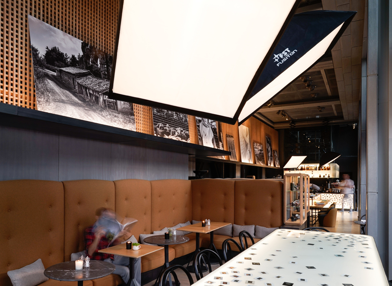 Located over an old Brewery founded by the Bomonti Brothers, the projects plays with images and photography related items to create a warm and nostalgic experience. Visitors will find essential features borrowed from a professional photo studio, such light boxes, diffusers, and umbrellas.