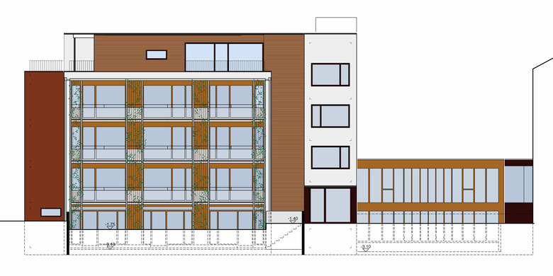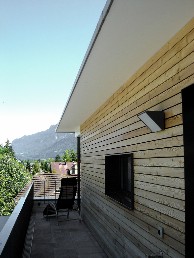 Die Zimmer des Attikageschosses sind mehrheitlich zweiseitig orientiert und weisen einen höheren Ausbaustandard auf. Durch die Fassadenverkleidung aus Holz hebt sich das Dachgeschoss vom verputzten, zweifarbigen Hauptbaukörper ab.