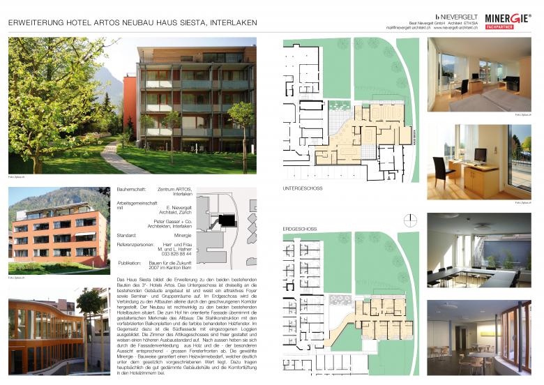 Das Haus Siesta bildet die Erweiterung zu den beiden bestehenden Bauten des Hotel Artos. Das Untergeschoss ist dreiseitig an die bestehenden Gebäude angebaut und weist ein Foyer sowie Seminar- und Gruppenräume auf. Im Erdgeschoss stellt der nach Norden geschwungene Korridor die Verbindung zu den Altbauten her.