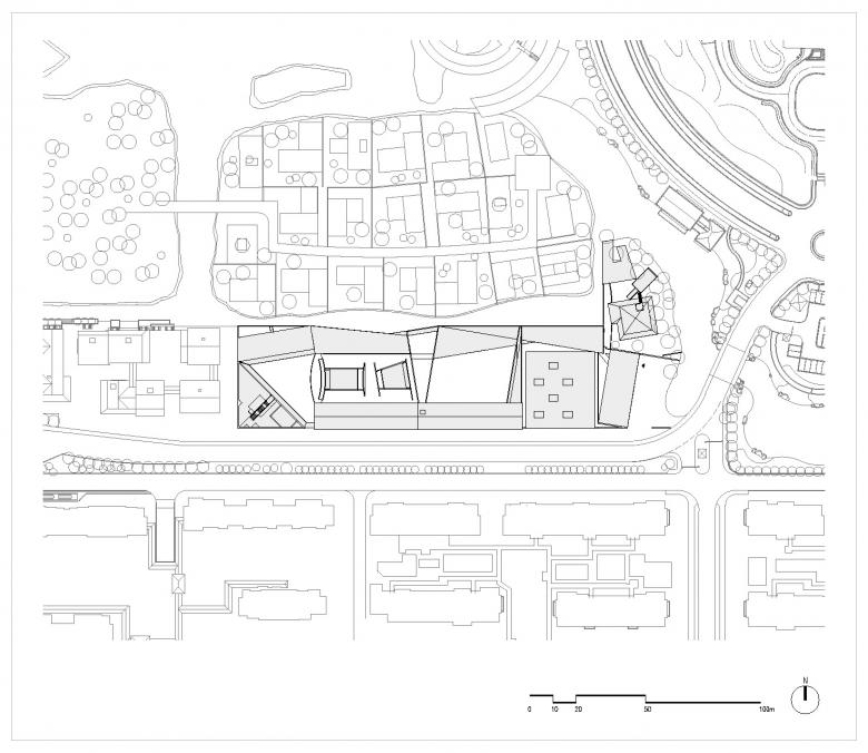 The essence of an art museum is to provide a wandering experience. This art museum is intended to be a playground of space and time. Therefore, besides perspectival manipulation, we introduced the concept of “pure architectural space”: a series of outdoor or semi-outdoor spaces serving as transitions between programs. They are configured to possess dramatic tensions, intensifying the temporal and spatial dynamics during the journey through the architecture. The overall spatial structure of this building complex is arranged in Yuan (courtyards) and Jin (layers), generating a dialogue with the Chinese architectural.