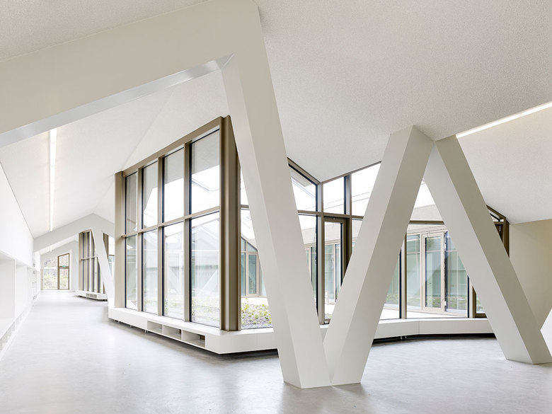Die weitgespannte Deckenkonstruktion der Turnhalle wurde mit Hilfe von geschosshohen Stahlfachwerkträgern realisiert, die als Auflager für die als Faltwerk ausgebildete Dachkonstruktion dienen, zwei Lichthöfe unterbrechen die Faltdecke. Die Hauptspannweite der Decke im Turnhallenbereich liegt bei ca. 30m.