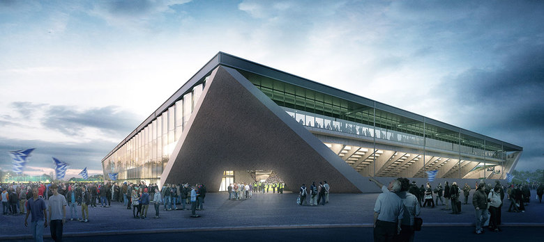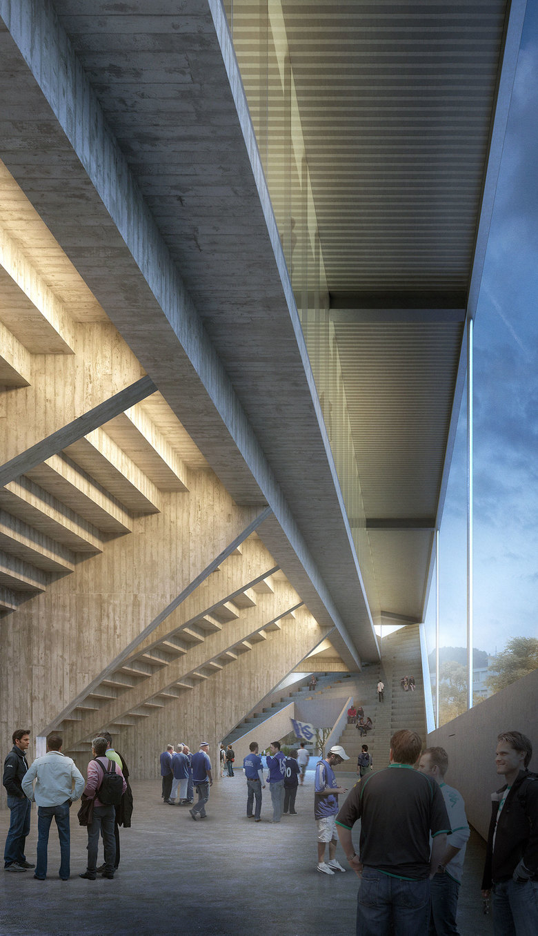 Eine leichte Dachkonstruktion und eine schalenartige Tribünenkonstruktion in Massivbauweise bilden das Tragwerk des Stadions. Die vier aufgefalteten, rund 13 m hohen, Ecken des Stadions charakterisieren das eigentliche Schalentragwerk. Diese schiefen Ebenen werden als Platten in Ortsbeton hergestellt. Die schrägen Platten werden im oberen Drittel von einem horizontal umlaufenden vorgespannten Zugring zusammen gehalten. Der L-förmig ausgebildete Zugring wird von den Tribünenschotten in regelmässigen Abständen von 18.60 m getragen. Er dient zusätzlich als Auflager für die dazwischen liegenden vorfabrizierten Sägezahnträger und ist zudem auch obere Zirkulationsebene. Auf den Sägezahnträgern und den an Ort hergestellten Tribünenschotten liegen die vorfabrizierten Winkelstufen für die Sitze.