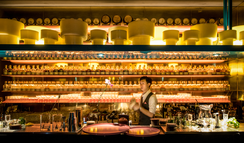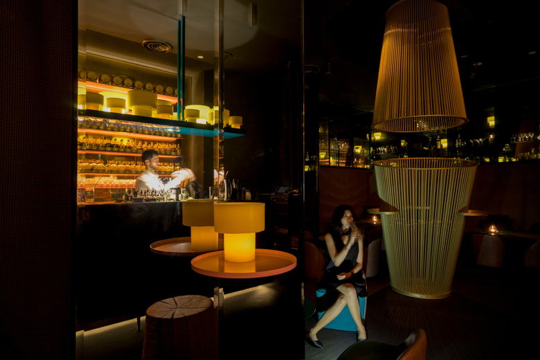 The squared space, that can be entered both through the Marriot’s lobby or the street, is encircled by curtains that help to preserve the atmosphere untouched. Once inside, the space is, so to speak, divided in two areas. At the main entrance, a black marbled bar containing two cocktail stations stand under a golden and pink brass backlighted wall-shelf. From its top, a great amount of wax-lamps specially made for this project, crown the showcased bottled spirits. The visitor will be able to read a Harry Johnson’s inscription at the bar while seated in one of the three unique trunk handmade stools designed and brought to Singapore from Spanish woods.