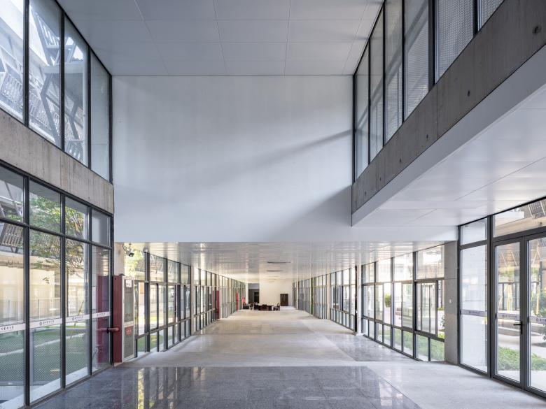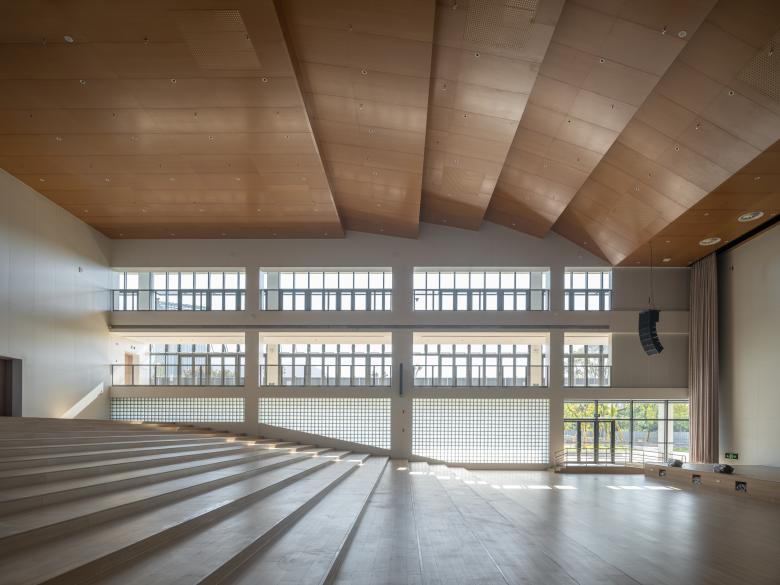 Students and educators can opt for suitable spaces for study, communication, or other activities amid diverse weather conditions. The substantial overhanging eaves between two blocks form an open-air hall, facilitating collective public events like concerts or sports activities. Through architectural creativity, we aim to entice Wenzhou Medical University's students and faculty to embrace a lifestyle with ambiguous indoor-outdoor boundaries, fostering a heightened awareness of their geographical surroundings. During the design phase, we gained insights from the ophthalmologists at Wenzhou Medical University that underscore the ocular health benefits of the natural light environment beneath tree canopies or eaves.