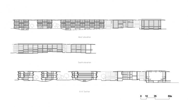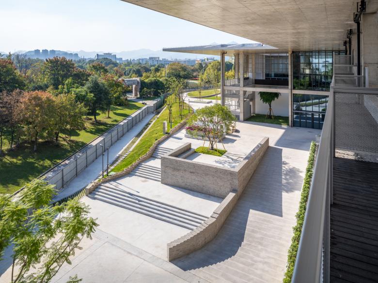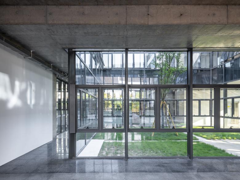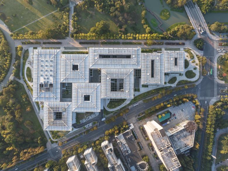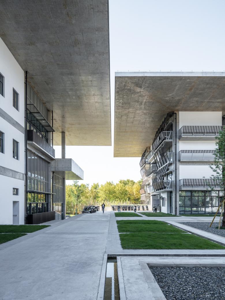 Subsequently, the typically closed-up building is broken, turning into a four-layered spatial arrangement from the center to the periphery: the central courtyard (outdoor), the air-conditioned zone (indoor), the veranda (semi-indoor), and the area under the overhang (semi-outdoor). The latter two layers serve as transitions between indoor and outdoor spaces, constituting a Gray Space. Shaded by projecting roofs and inheriting the traditional deep eaves from Chinese timber architecture, each building adopts an umbrella-inspired section with a 10m deep cantilever. The roofs of the entire complex are thus joined into an abstract continuous "tree canopy" by aligning the eaves of the eight structures on the same plane. This canopy is only disrupted by three large courtyards - two enclosed on four sides and one on three – and with 50cm wide gaps between the 8 small-courtyard-punctured individual buildings. The 50cm wide "sky slit" admits sunlight or rainwater into the Gray Space, crafting a landscape that blends architectural and natural elements. The veranda space takes the shape of a series of open rooms, shielded from the weather by the deep eaves.
