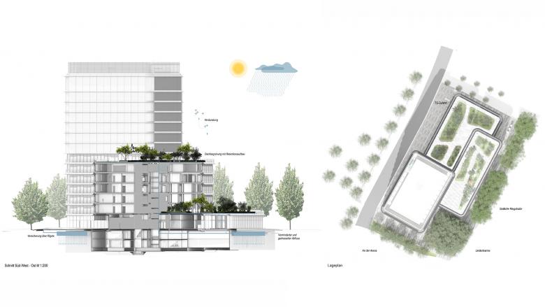 Dem Umgang mit anfallendem Regenwasser wurde eine zentrale Bedeutung beigemessen. Die Regenwasserrückhaltung von Standardregenereignissen und Starkregen konnte auf dem Grundstück und auf den Dächern umgesetzt werden. Dach- und Freiflächen fungieren als multifunktionale Retentionsräume, Regenwasserzisternen werden für die Freiflächenbewässerung genutzt. Ein kontrollierter Abfluss von Oberflächenwasser bei außergewöhnlichen Starkregenereignissen wurde vorgesehen und teilweise in Versickerungsmulden geführt. Das anfallende Regenwasser der befestigten Flächen und Dachoberflächen des 1. und 5. Obergeschosses wird durch den Einbau eines Retentionsdaches zurückgehalten und bei Starkregenereignissen gedrosselt auf dem Grundstück versickert.