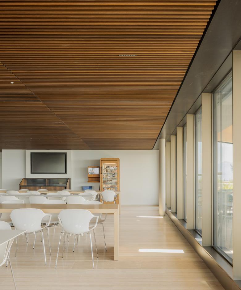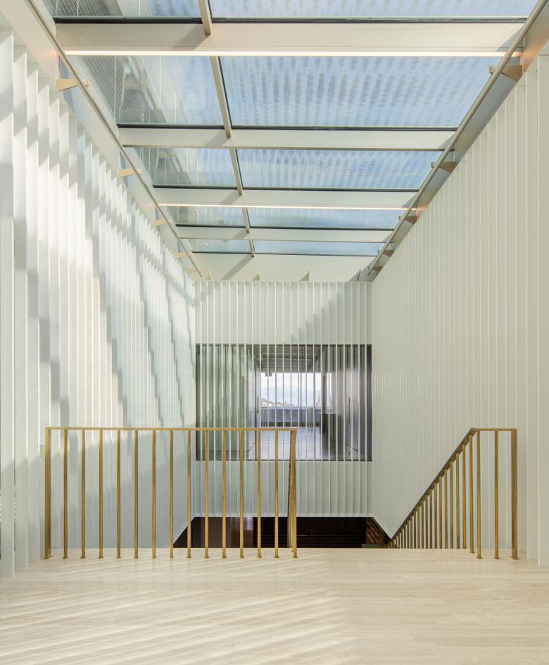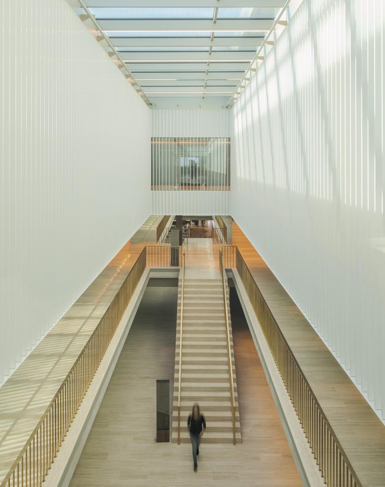 La bande centrale accueille un atrium surmonté d’une verrière conduisant la lumière naturelle jusqu’au coeur du bâtiment. Cet espace central intégrateur relie et distribue les trois niveaux. Il accueille des escaliers ainsi que des salles de réunion, et au 1er étage la bibliothèque et son espace de consultation.