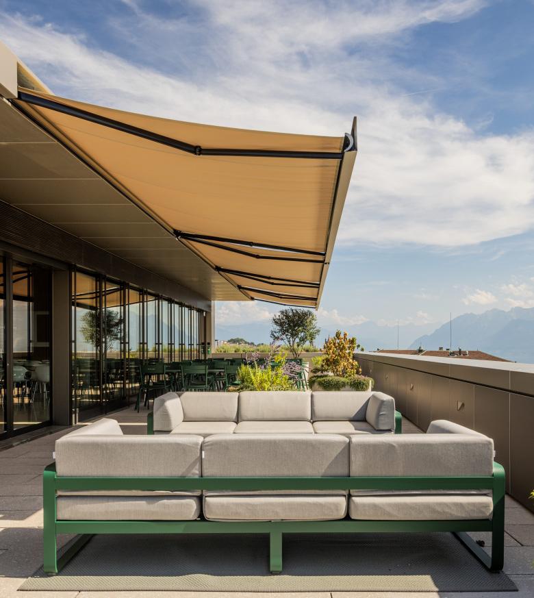La vérité des matériaux naturels est recherchée : le béton, le bois, l’aluminium, ainsi que le laiton –clin d’œil à l’architecture d’intérieur historique du Palais de Beaulieu, dans une mise en œuvre contemporaine et rigoureuse, avec sophistication mais sans ostentation.