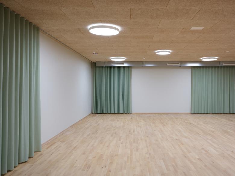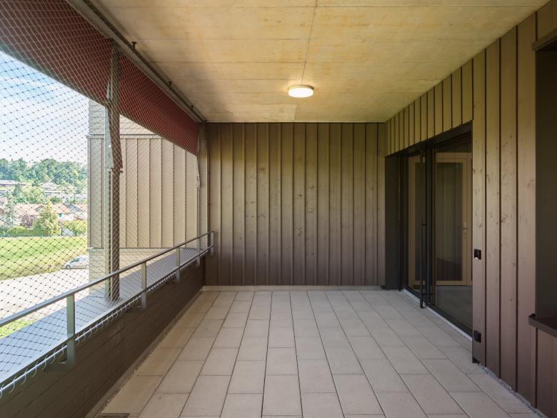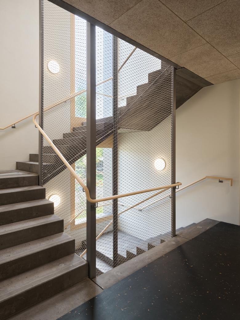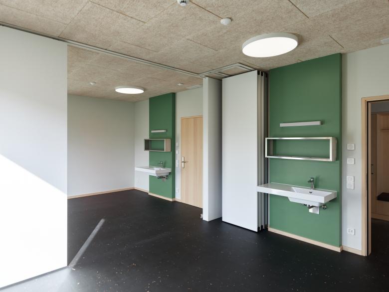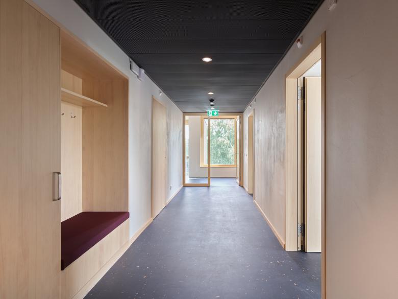 Im Inneren wurden bewusst reizarme und robuste Materialien eingesetzt. Die dezente Farbgebung und der Einsatz von Holz erzeugen eine beruhigende und wohnliche Atmosphäre. Auf jedem der drei Geschosse befindet sich eine 4er-Wohngruppe. Alle Zimmer verfügen über einen Ausblick zur Landwirtschaftszone und ein eigenes Bad. Dazu gehören Gemeinschaftsräume für Kochen, Essen und Wohnen sowie Ateliers, ein Fitness- und Therapiebereich und Büros für das Betreuungspersonal.