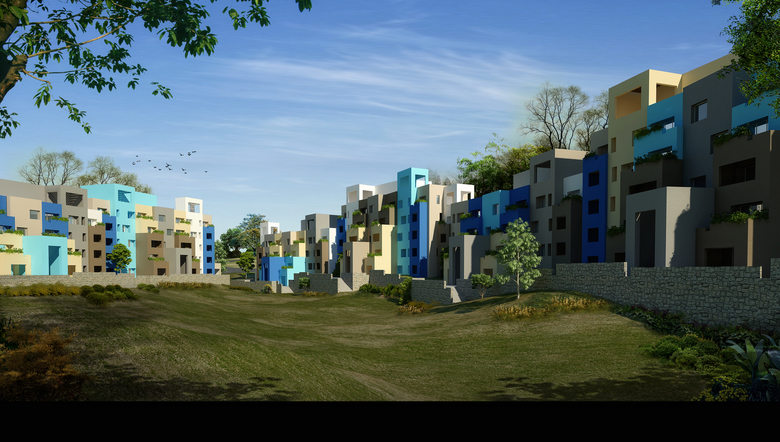 Each of the residential blocks too, designed in structures of 2, 3, 4, & 5 levels are fragmented to create series of volumes interspersed with landscaped spaces creating an organic series of built forms like the traditional cities of the region. These are coloured in the traditional lime plaster in varying hues of blues and yellows. The layout of apartments are done along the existing slopes of the site with minimal intervention creating north , north east and north west facing apartments in the entire layout.