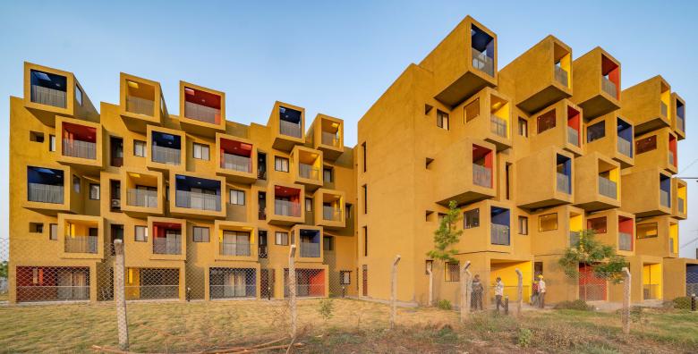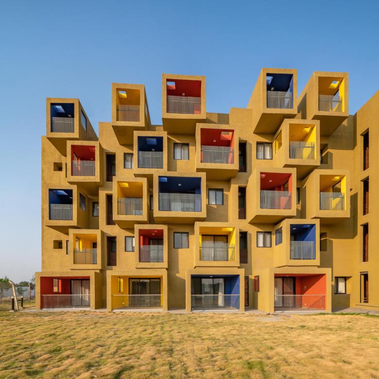 Composition of coloured cuboids defines this sculptural residential project. The brief for these mid-rise buildings in Kodla, Karnataka, India was to create studio apartments, a hostel, and a guest house to house workers of a new cement plant, on the perimeter of a housing project for a residential township.