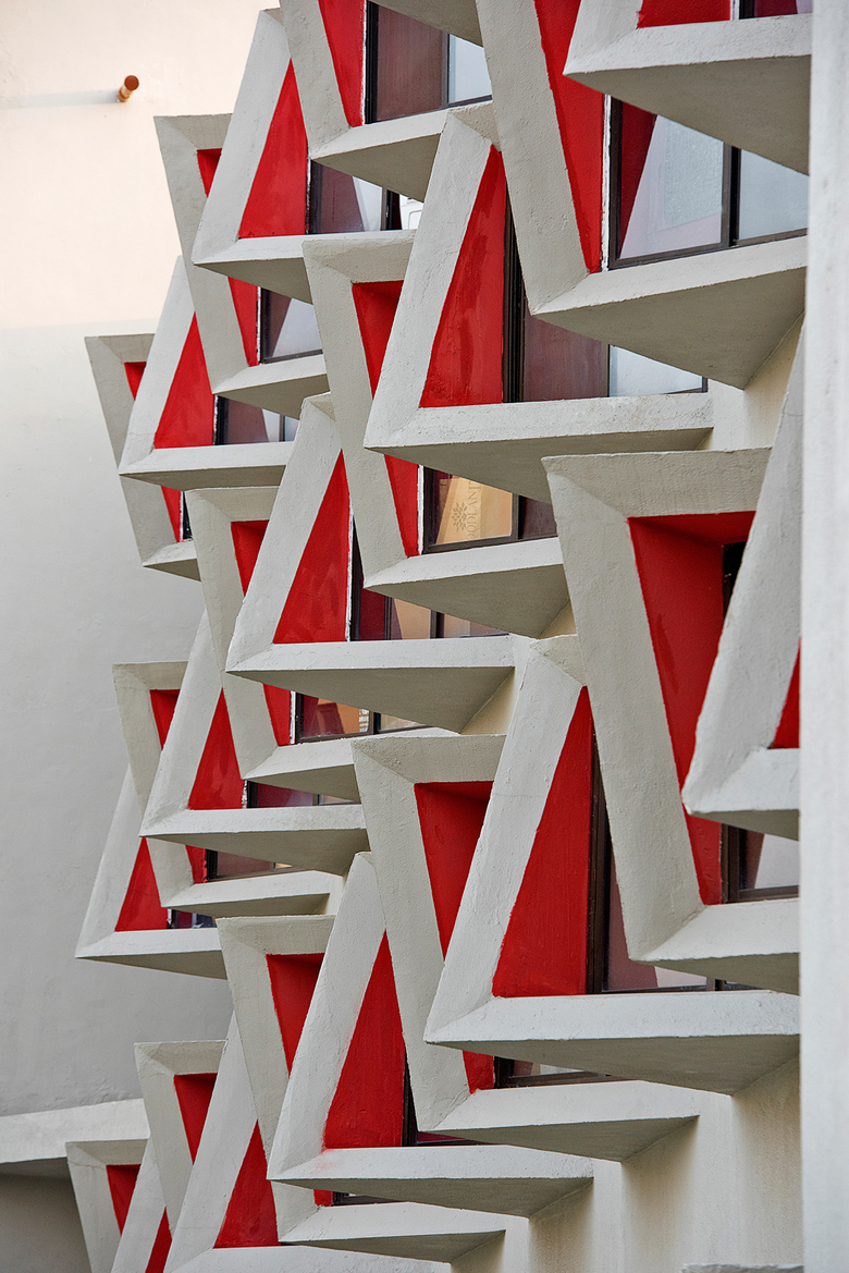 The organic layout of the buildings characterizes each space within the site. Color accentuates different blocks and facilitates within. Each block is differently colored along with the internal face of the bay windows of the hostel in bright colors to create an identity.