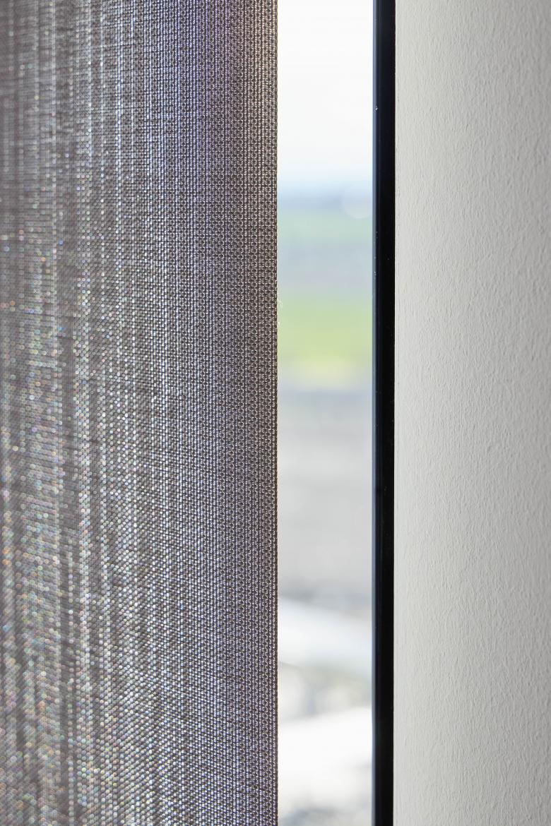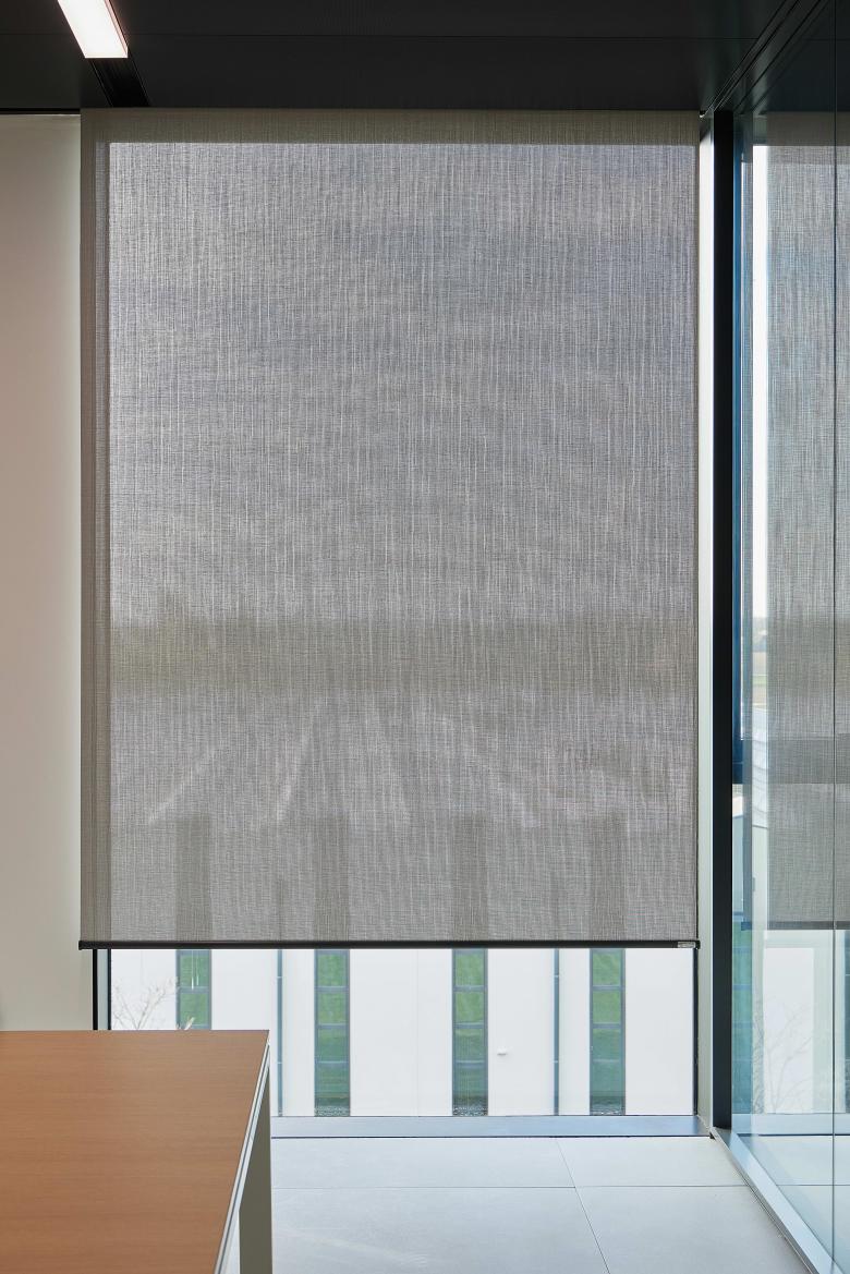 Aufgrund der monolithischen Gestaltung mit der Gebäudehülle aus Aluminiumgewebe, die hier über sämtliche Fensterflächen gezogen wurde, mussten Blendschutz und Kontrolle von zu starker Hitze- und Lichtintensität in Form eines innenliegenden Sonnenschutzes umgesetzt werden.