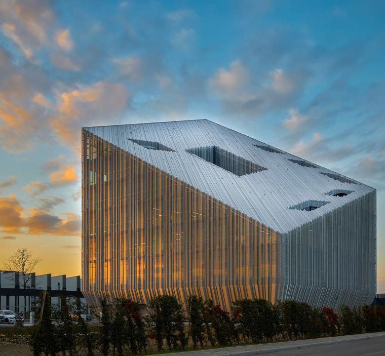 Von Süden und Osten her betrachtet, erscheint das Gebäude jedoch wie ein weißer Monolith in der Landschaft. Dieser Eindruck entsteht durch die Bekleidung von Fassade und Schrägdach mit maßgefertigten, gefalzten Elementen aus Aluminium-Gewebe. Neben der Filterung von intensivem Licht sorgen diese Fassadenelemente für ein angenehmes Raumklima bei gleichzeitiger Stärkung der Energieeffizienz. Die plissierte Anmutung ist von den Zahnrädern für die Getriebekomponenten inspiriert, während die Materialität an die Ressourcen erinnert, mit denen viele der Komponenten hergestellt werden: Aluminium.
