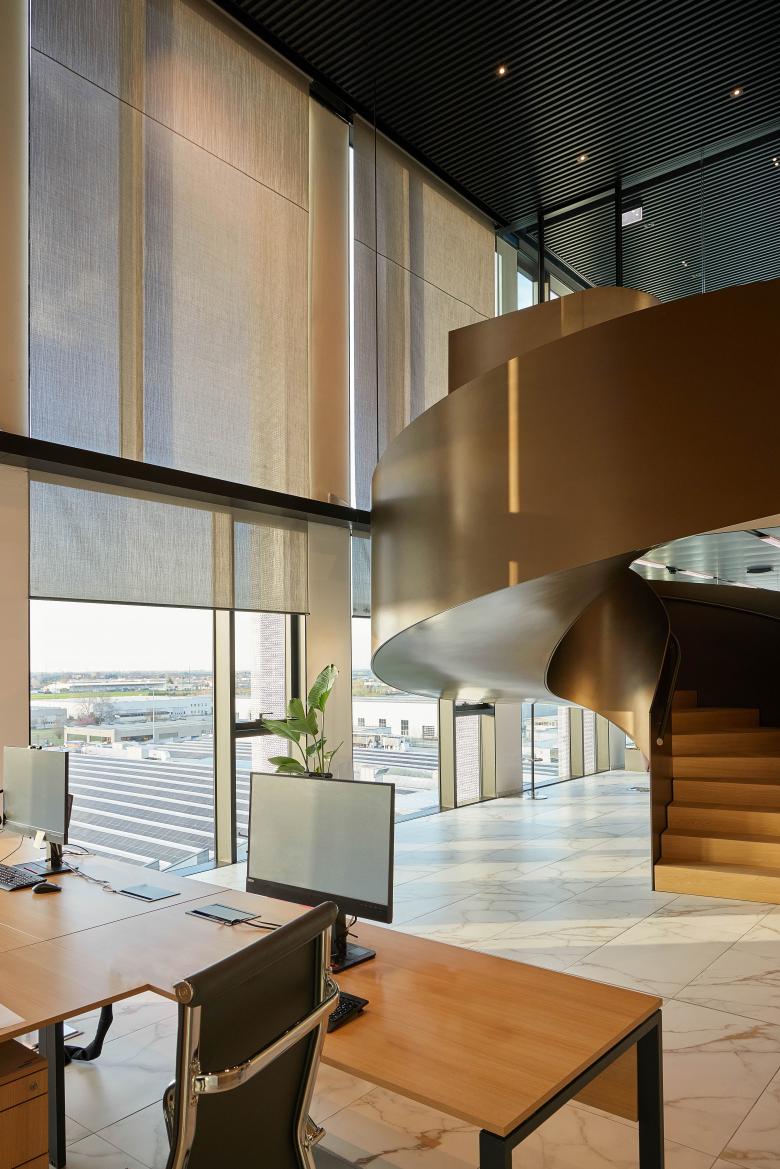 Besonders anspruchsvoll waren dabei die Rollos für das Executivegeschoss, die mehr als 6 Meter Auszugshöhe haben und von einer Arbeit zeugen, die über das Sichtbare hinausgeht und funktionale Lösungen mit starker szenischer Wirkung bieten.