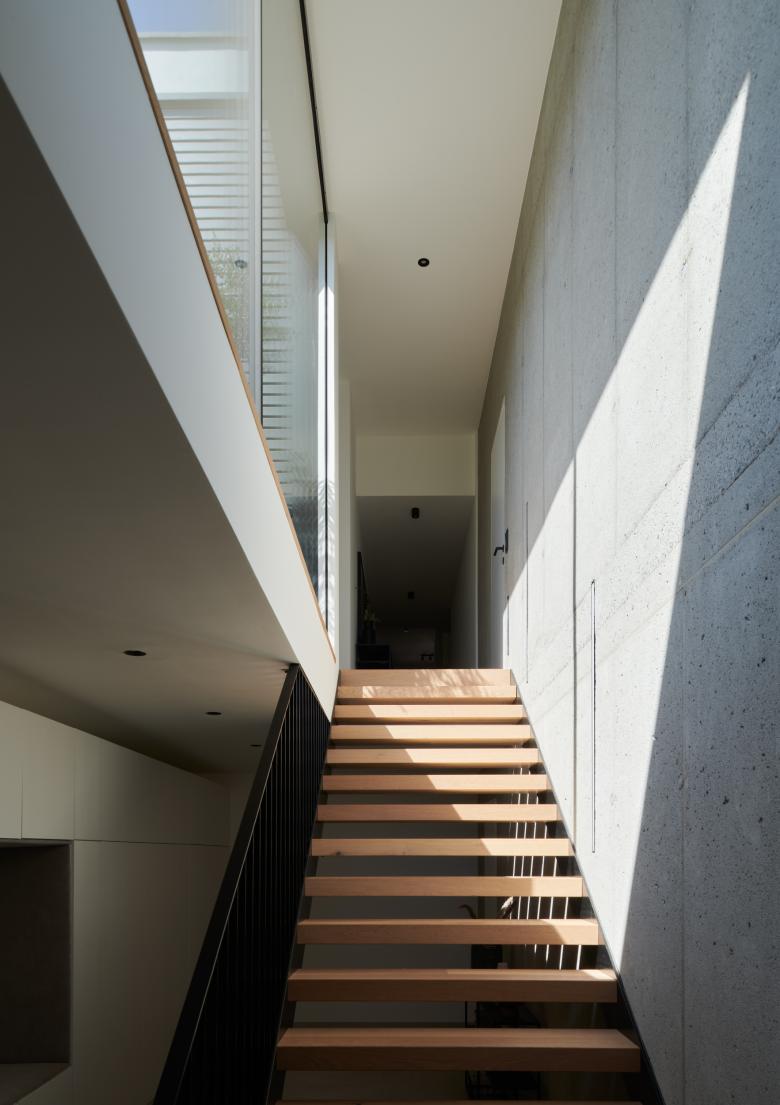 Um den Fußabdruck des Gebäudes zu minimieren wurden die Autostellplätze, diverse Nebenräume und der Haupteingang des Neubaus in das Untergeschoss situiert. Diese Art der Erschließung konnte mittels einer Rampe realisiert werden. Vom Eingang führt eine Schwarzstahltreppe ins Erdgeschoss. Große Glasflächen sorgen hier für eine helle und lichtdurchflutete Atmosphäre. Überdies dient die Treppe nicht nur der vertikalen Erschließung, sondern erzeugt zusammen mit dem einfallenden Sonnenlicht ein besonderes Lichtspiel und wird so zu einem optischen Highlight.