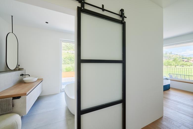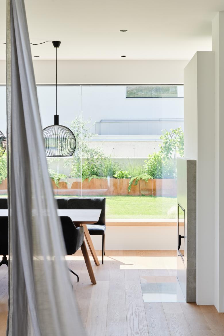 Durch den hohen Luftraum im Aufgang wird ein großzügiges Raumgefühl kreiert. Um dies auch in den Wohnbereich zu tragen, wurde der gesamte Neubau mit einer Deckenhöhe von etwa drei Metern umgesetzt. Zahlreiche Freibereiche im Inneren schaffen zusätzlich Flexibilität und Komfort. Die Raumgrenzen im Inneren verschwimmen bewusst, um eine nahtlose Verbindung zwischen den verschiedenen Bereichen zu schaffen. Trotz des luftigen Raumkonzeptes bietet das Haus separate Bereiche für Kinder und Eltern. So verfügt der offen gestaltete Master-Bedroom über einen begehbaren Kleiderschrank und ein eigenes Badezimmer.