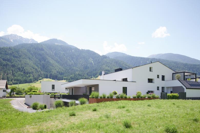 Daraus ergab sich die Leitidee, den Bestandsbau als weißen Monolithen zu inszenieren und den Neubau durch einen Einschub in den Bestand zu integrieren. In diesem Zug wurde die Fassade des Bestandes modernisiert und optisch an den Neubau angepasst, um ein einheitliches Erscheinungsbild zu schaffen. Große Glasflächen und Außenbereiche in Richtung Süden und Osten ermöglichen den Bewohner:innen, die unverbaute Aussicht zu genießen und stellen eine harmonische Verbindung zur umgebenden Landschaft her.