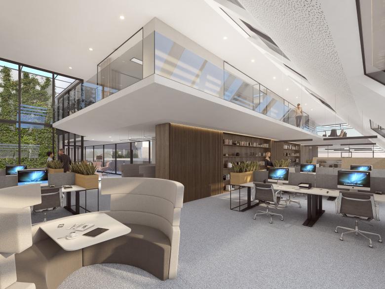 Durch den Ausbau des Dachgeschosses wird auf ca. 1100 m² Platz für eine offene, lichtdurchflutete Bürofläche geschaffen. Diese gewinnt durch die Errichtung eines Galeriegeschosses zusätzlich an Fläche und eine natürliche Raumtrennung wird erzeugt.
